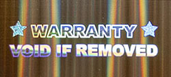 Главным изображением голограммы является текст “WARRANTY” и лента “VOID IF REMOVED”, размещена ниже. Изображение высокой четкости, с ярким контуром и градиентом цвета по внутренней части.